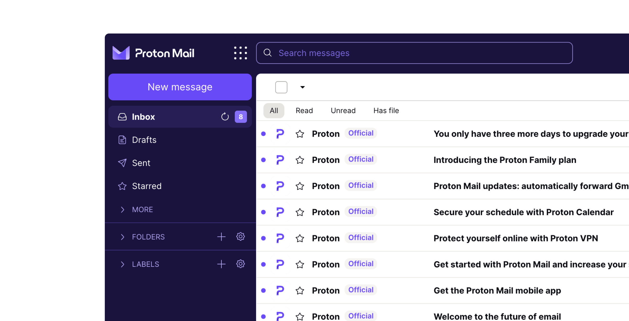 Source: Gmail screenshotProtonMail takes a different approach, letting users choose between seeing read, unread, and emails with files.